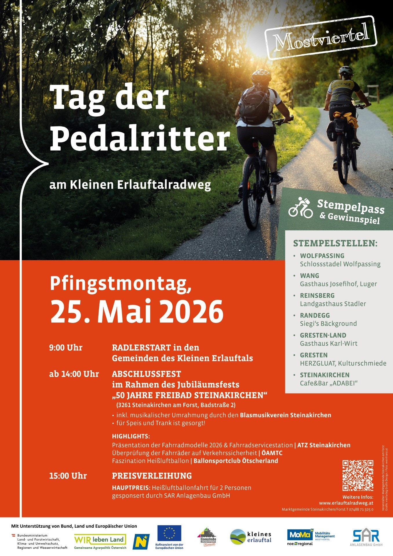 Der diesjährige Abschluss der Veranstaltung findet ab 14 Uhr im Zuge des 50-Jahre Freibad-Steinakirchen Jubiläumsfests statt. Für musikalische Umrahmung ist mit dem Blasmusikverein Steinakirchen ebenfalls gesorgt. Im Rahmen des Festes erwartet die Teilnehmer:innen auch ein Gewinnspiel mit attraktiven Preisen. Darunter als Hauptpreis eine Heißluftballonfahrt für zwei Personen gesponsert von der Firma SAR Anlagenbau GmbH.