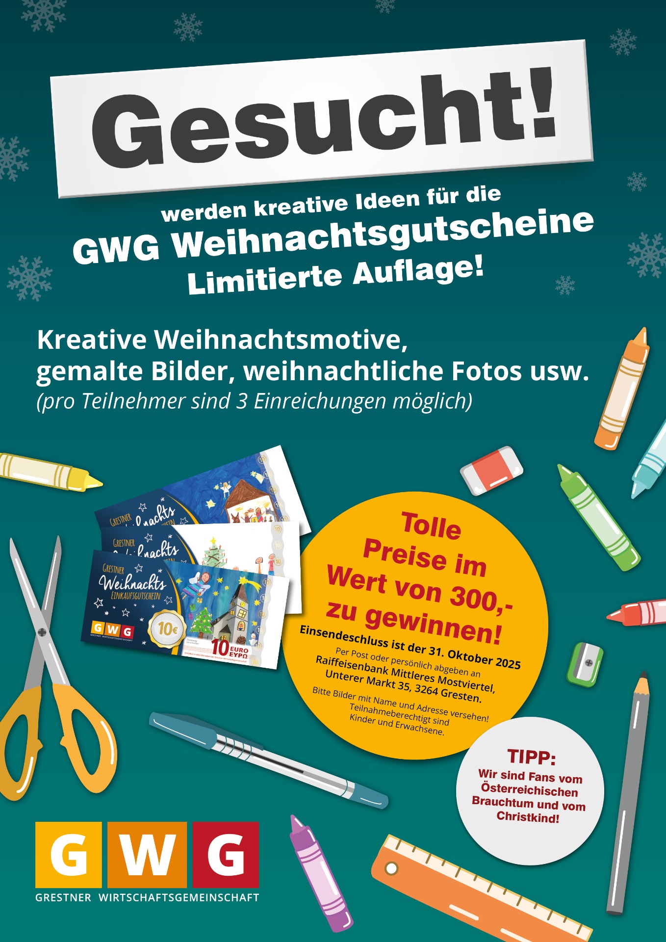 Bitte die Entwürfe an kontakt@gwg.co.at oder per Post an GWG, Oberer Markt 2, 3264 Gresten senden oder bei der Raiffeisenbank Gresten abgeben.