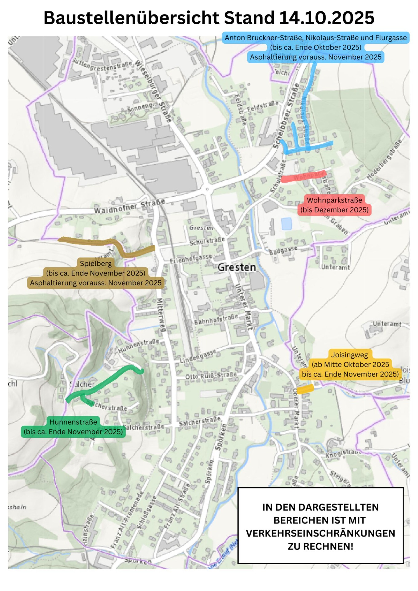 Übersicht Baustellenbetrieb in Gresten - Stand 14.10.2025