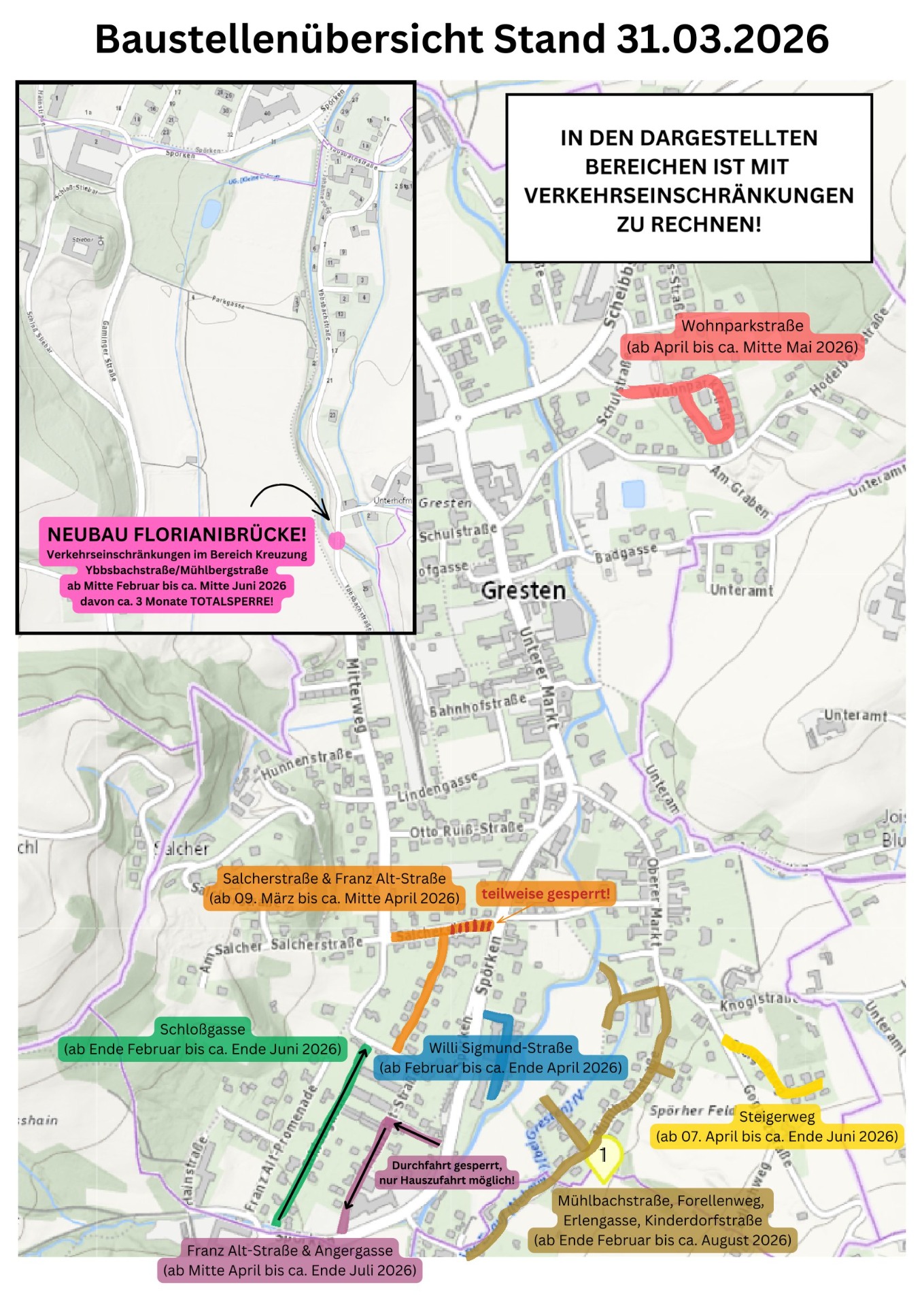 Übersicht Baustellenbetrieb in Gresten - Stand 31.03.2026